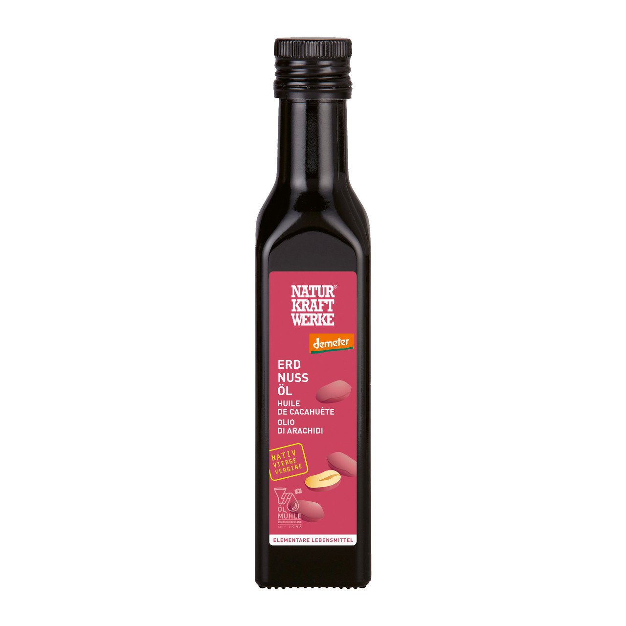Frisches Erdnussöl aus ganzen Kernen mit der roten Haut kaltgepresst. Das hellgelbe leicht nussig schmeckende Öl ist auch gut zum Braten und Frittieren geeignet. Es ist reich an einfach und mehrfach ungesättigten Fettsäuren.