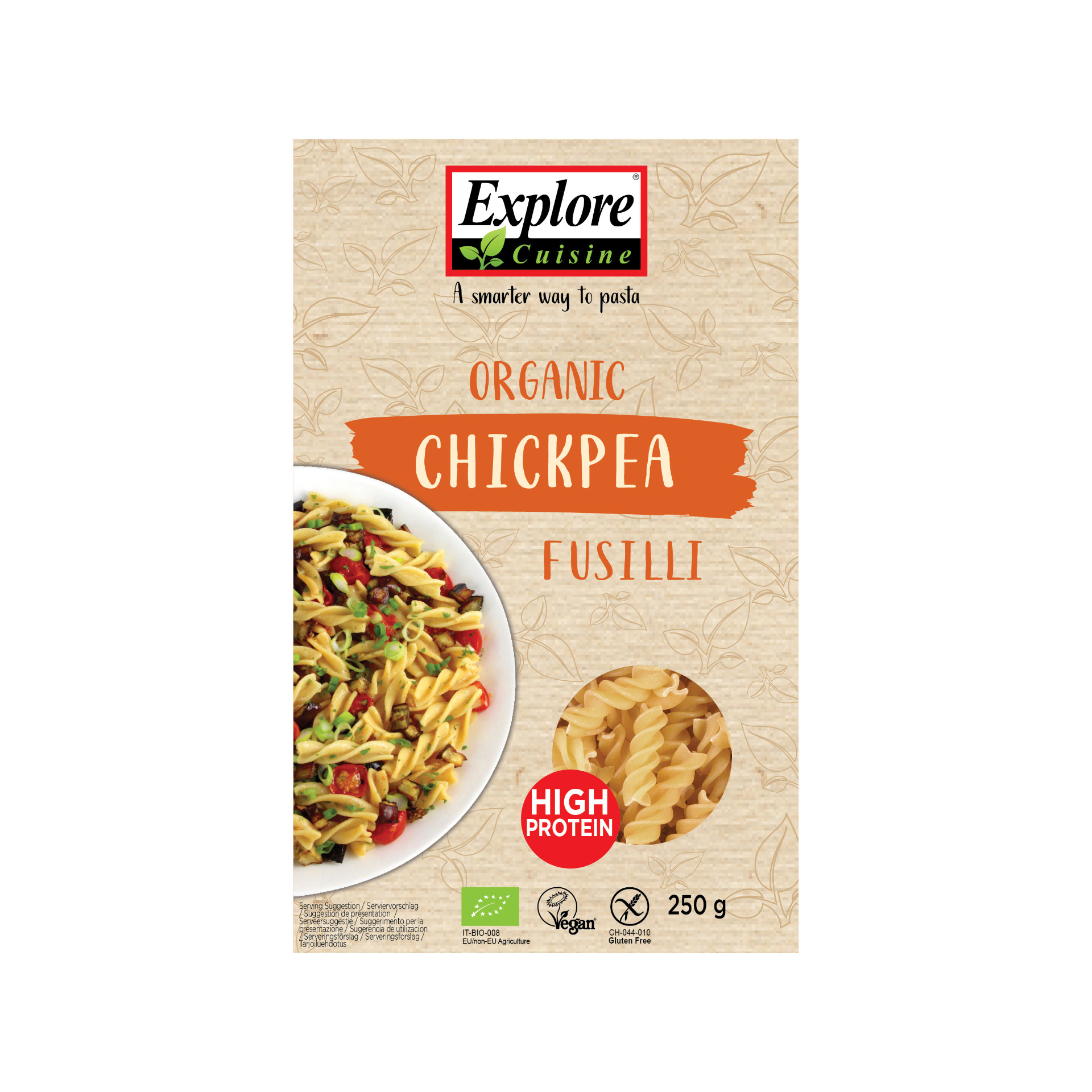 Ballaststoffreiche, proteinreiche, glutenfreie Fusilli aus biologischen Kichererbsen. 8 bis 10 Minuten al dente kochen.