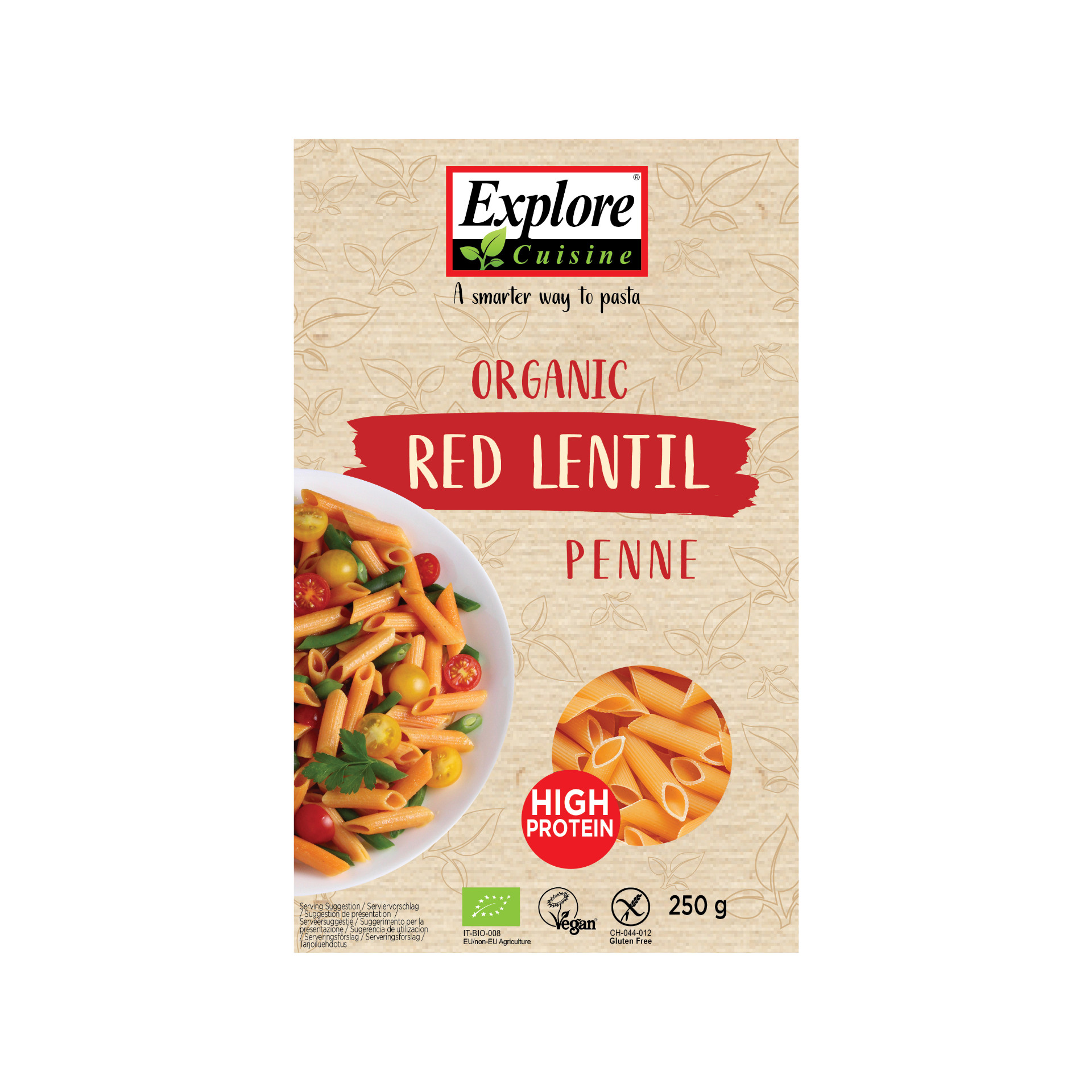 Ballaststoffreiche, proteinreiche, glutenfreie Pasta aus biologischen roten Linsen. 8 bis 10 Minuten al dente kochen.